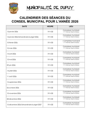 | 14 janvier 2026 extraordinaire budget 2026 | 19 h 00 | Complexe municipal |